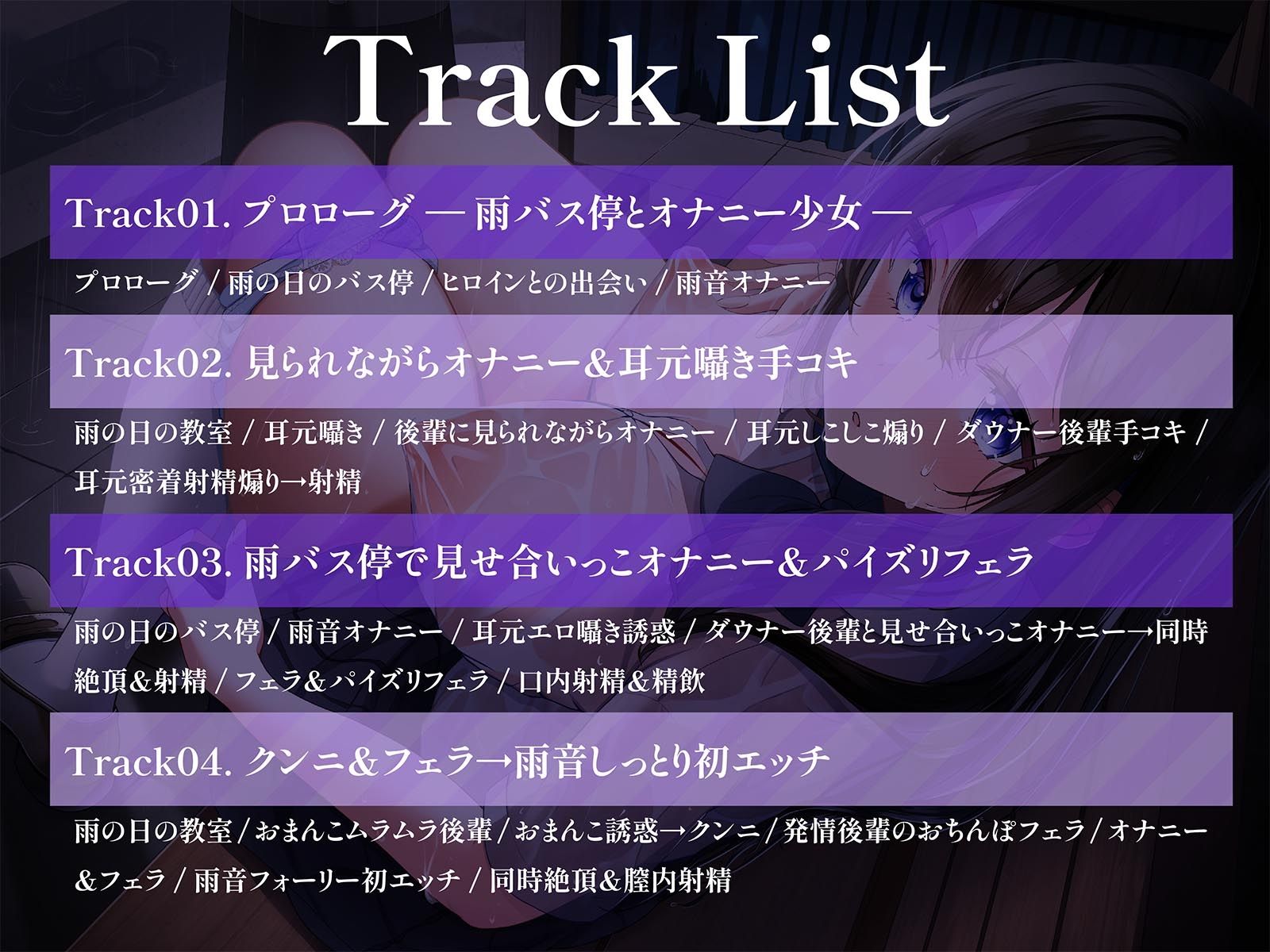 (雨の日のバス停/雨音オナニー/耳元エロ囁き誘惑/ダウナー後輩と見せ合いっこオナニー→同時絶頂&射精/フェラ&パイズリフェラ/口内射精&精飲)